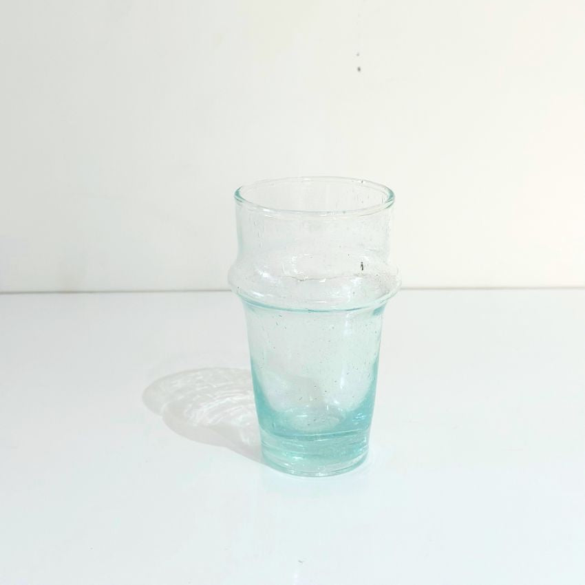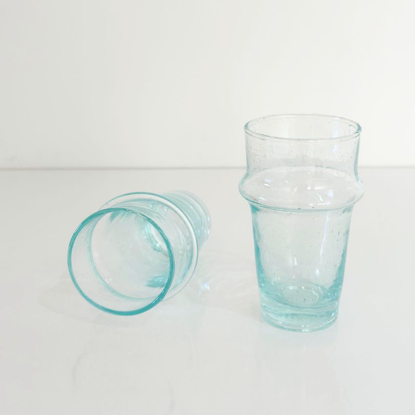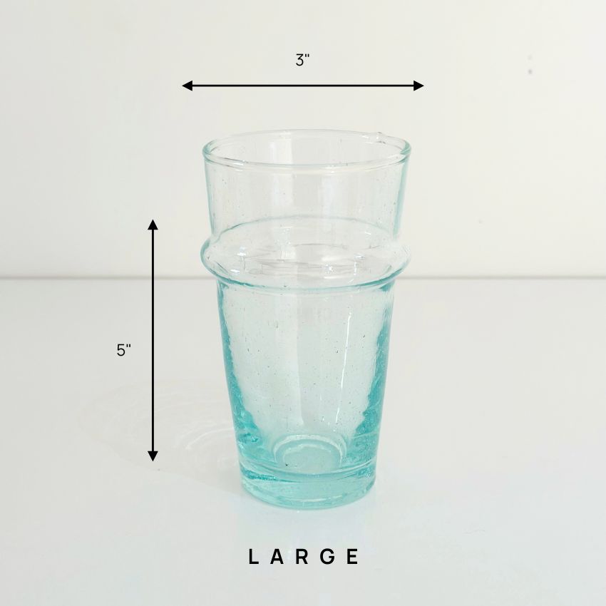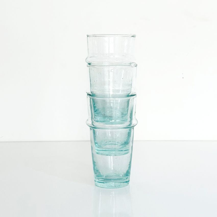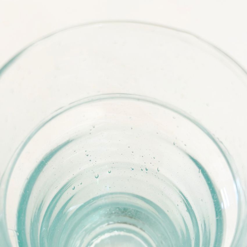 100% Handblown Recycled Glass, flared ridge for extra grip and to make stackable.